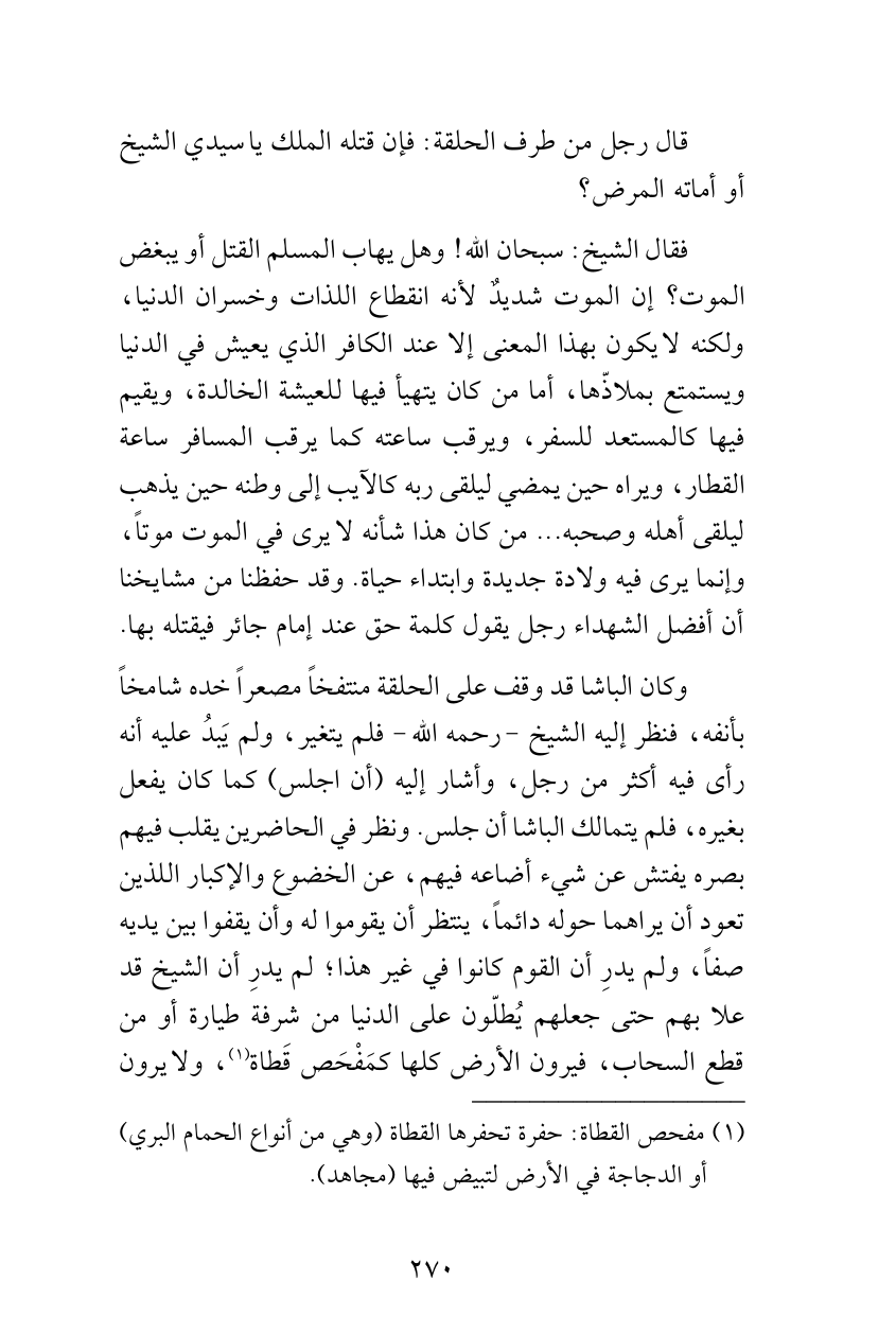 فقال الشيخ: سبحان الله! وهل يهاب المسلم القتل أو يبغض الموت؟ إن الموت شديدٌ لأنه انقطاع اللذات وخسران الدنيا، ولكنه لا يكون بهذا المعنى إلا عند الكافر الذي يعيش في الدنيا ويستمتع بملاذّها، أما من كان يتهيأ فيها للعيشة الخالدة، ويقيم فيها كالمستعد للسفر، ويرقب ساعته كما يرقب المسافر ساعة القطار، ويراه حين يمضي ليلقى ربه كالآيب إلى وطنه حين يذهب ليلقى أهله وصحبه ... من كان هذا شأنه لا يرى في الموت موتاً، وإنما يرى فيه ولادة جديدة وابتداء حياة. وقد حفظنا من مشايخنا أن أفضل الشهداء رجل يقول كلمة حق عند إمام جائر فيقتله بها.