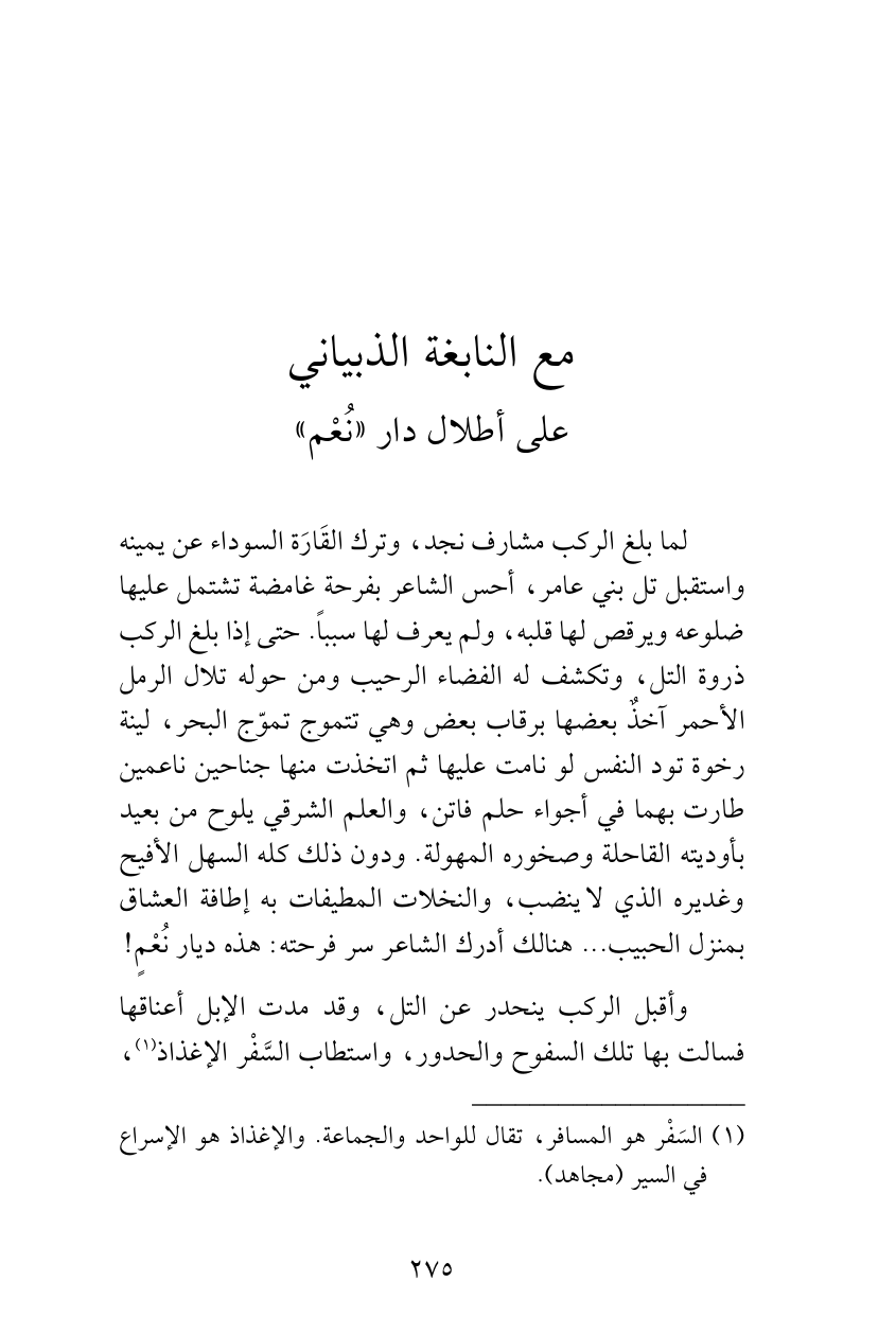 لما بلغ الركب مشارف نجد، وترك القَارَة السوداء عن يمينه واستقبل تل بني عامر، أحس الشاعر بفرحة غامضة تشتمل عليها ضلوعه ويرقص لها قلبه، ولم يعرف لها سبباً. حتى إذا بلغ الركب ذروة التل، وتكشف له الفضاء الرحيب ومن حوله تلال الرمل الأحمر آخذٌ بعضها برقاب بعض وهي تتموج تموّج البحر، لينة رخوة تود النفس لو نامت عليها ثم اتخذت منها جناحين ناعمين طارت بهما في أجواء حلم فاتن، والعلم الشرقي يلوح من بعيد بأوديته القاحلة وصخوره المهولة. ودون ذلك كله السهل الأفيح وغديره الذي لا ينضب، والنخلات المطيفات به إطافة العشاق بمنزل الحبيب ... هنالك أدرك الشاعر سر فرحته: هذه ديار نُعْمٍ!