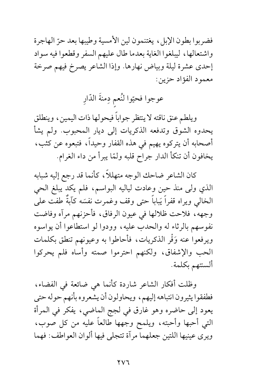 كان الشاعر ضاحك الوجه متهللاً، كأنما قد رجع إليه شبابه الذي ولى منذ حين وعادت لياليه البواسم، فلم يكد يبلغ الحي الخالي ويراه قفراً يَباباً حتى وقف وغمرت نفسَه كآبةٌ طفت على وجهه، فلاحت ظلالها في عيون الرفاق، فأحزنهم مرآه وفاضت نفوسهم بالرثاء له والحدب عليه، وودوا لو استطاعوا أن يواسوه ويرفعوا عنه وَقْر الذكريات، فأحاطوا به وعيونهم تنطق بكلمات الحب والإشفاق، ولكنهم احترموا صمته وأساه فلم يحركوا ألسنتهم بكلمة.