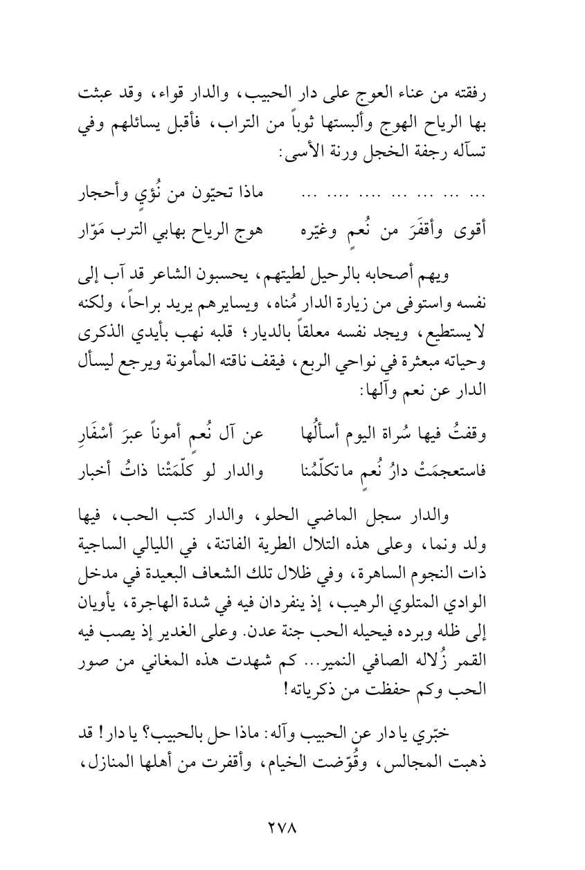 رفقته من عناء العوج على دار الحبيب، والدار قواء، وقد عبثت بها الرياح الهوج وألبستها ثوباً من التراب، فأقبل يسائلهم وفي تسآله رجفة الخجل ورنة الأسى:
