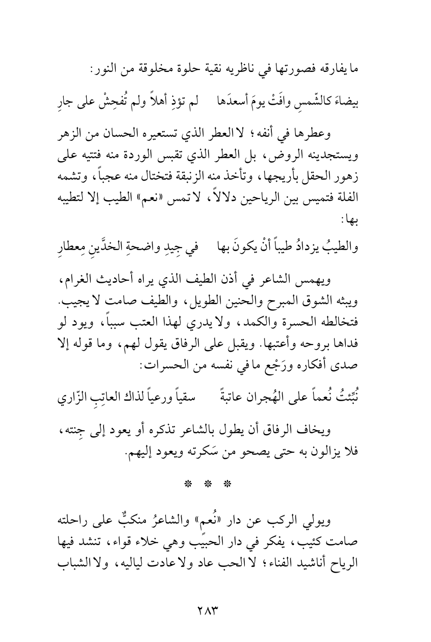 ويولي الركب عن دار «نُعمٍ» والشاعرُ منكبٌّ على راحلته صامت كئيب، يفكر في دار الحبيب وهي خلاء قواء، تنشد فيها الرياح أناشيد الفناء؛ لا الحب عاد ولا عادت لياليه، ولا الشباب