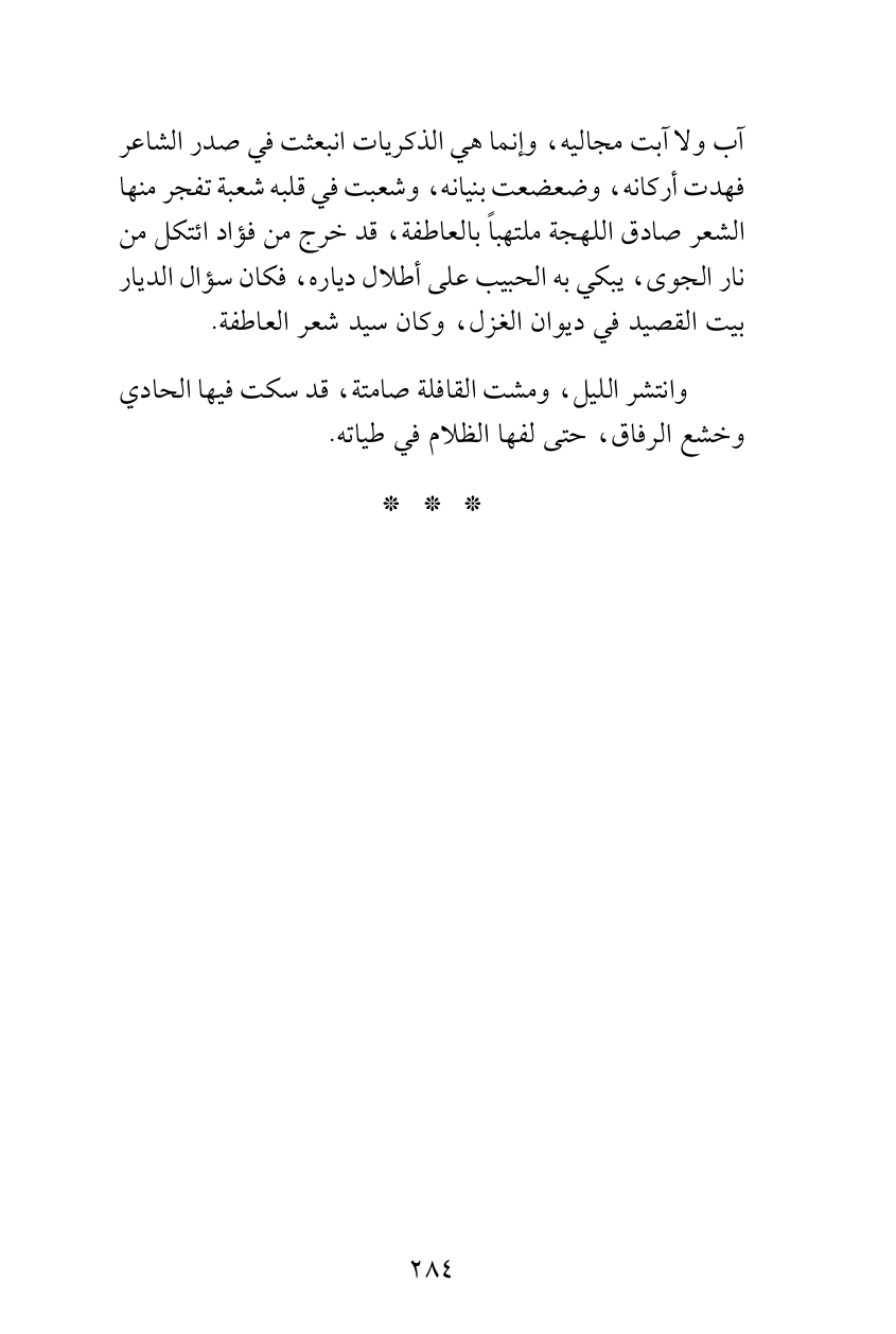 آب ولا آبت مجاليه، وإنما هي الذكريات انبعثت في صدر الشاعر فهدت أركانه، وضعضعت بنيانه، وشعبت في قلبه شعبة تفجر منها الشعر صادق اللهجة ملتهباً بالعاطفة، قد خرج من فؤاد ائتكل من نار الجوى، يبكي به الحبيب على أطلال دياره، فكان سؤال الديار بيت القصيد في ديوان الغزل، وكان سيد شعر العاطفة.