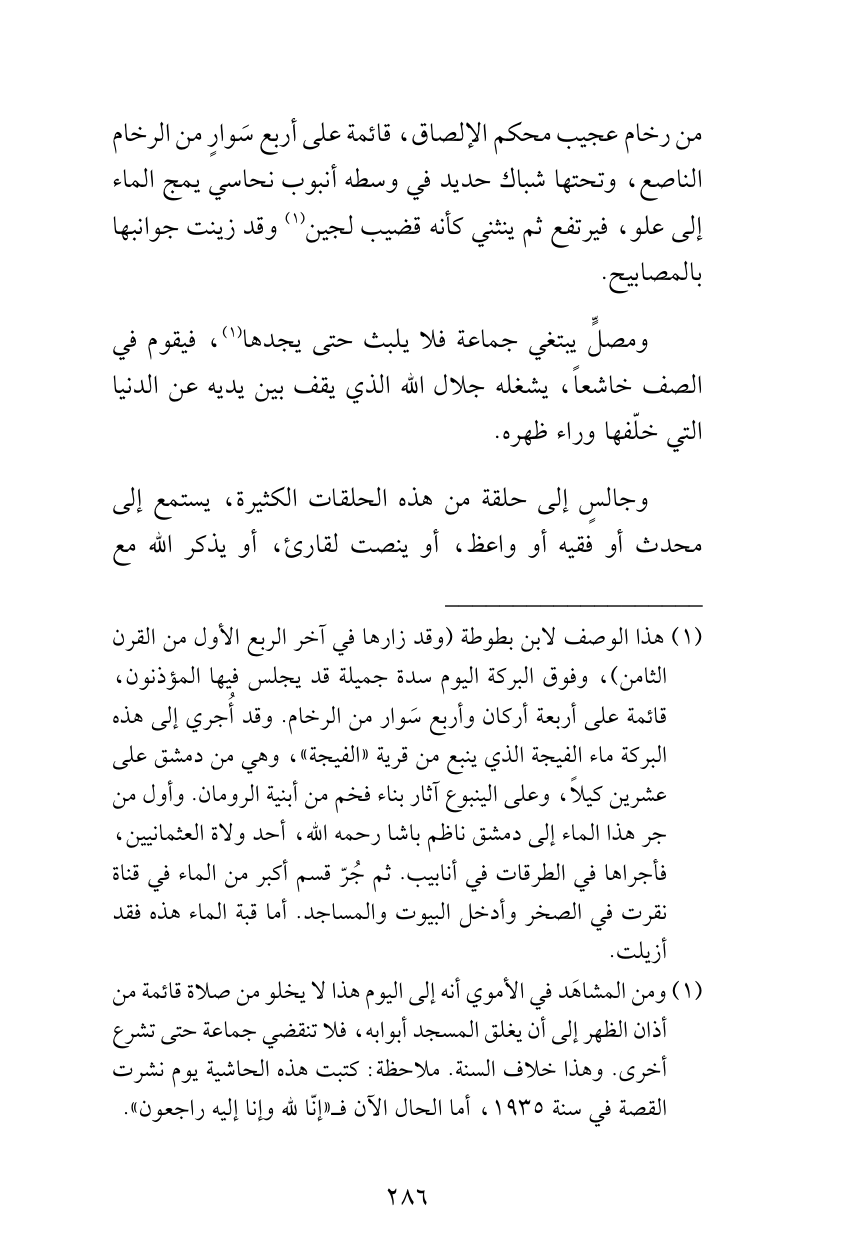 (¬2) ومن المشاهَد في الأموي أنه إلى اليوم هذا لا يخلو من صلاة قائمة من أذان الظهر إلى أن يغلق المسجد أبوابه، فلا تنقضي جماعة حتى تشرع أخرى. وهذا خلاف السنة. ملاحظة: كتبت هذه الحاشية يوم نشرت القصة في سنة 1935، أما الحال الآن فـ «إنّا لله وإنا إليه راجعون».