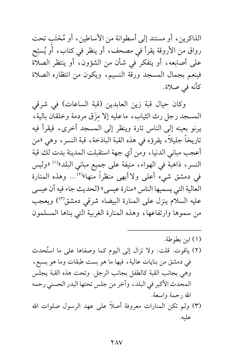 وكان حيال قبة زين العابدين (قبة الساعات) في شرقي المسجد رجل رث الثياب، ما عليه إلا مِزَق مردمة وخلقان بالية، يرنو بعينه إلى الناس تارة وينظر إلى المسجد أخرى، فيقرأ فيه تاريخاً جليلاً، يقرؤه في هذه القبة الباذخة، قبة النسر، وهي «من أعجب مباني الدنيا، ومن أي جهة استقبلت المدينة بدت لك قبة النسر، ذاهبة في الهواء، منيفة على جميع مباني البلد» (¬1) «وليس في دمشق شيء أعلى ولا أبهى منظراً منها» (¬2) ... وهذه المنارة العالية التي يسميها الناس «منارة عيسى» (لحديث جاء فيه أن عيسى عليه السلام ينزل على المنارة البيضاء شرقي دمشق (¬3)) ويعجب من سموها وارتفاعها، وهذه المنارة الغربية التي بناها المسلمون