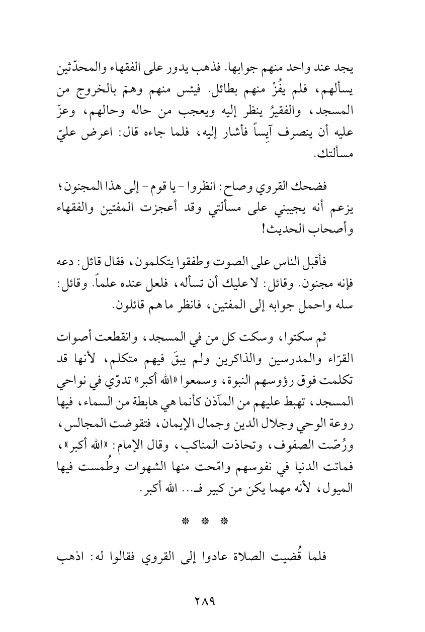 فضحك القروي وصاح: انظروا - يا قوم - إلى هذا المجنون؛ يزعم أنه يجيبني على مسألتي وقد أعجزت المفتين والفقهاء وأصحاب الحديث!