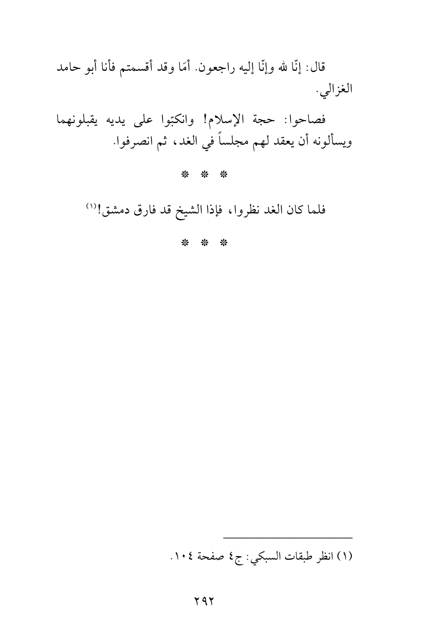 فصاحوا: حجة الإسلام! وانكبّوا على يديه يقبلونهما ويسألونه أن يعقد لهم مجلساً في الغد، ثم انصرفوا.