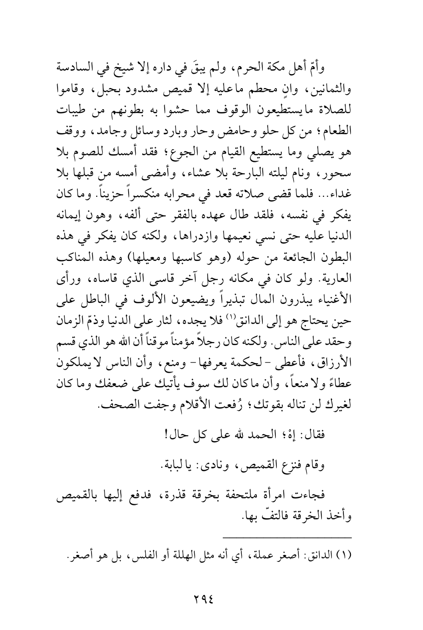وأمّ أهل مكة الحرم، ولم يبقَ في داره إلا شيخ في السادسة والثمانين، وانٍ محطم ما عليه إلا قميص مشدود بحبل، وقاموا للصلاة ما يستطيعون الوقوف مما حشوا به بطونهم من طيبات الطعام؛ من كل حلو وحامض وحار وبارد وسائل وجامد، ووقف هو يصلي وما يستطيع القيام من الجوع؛ فقد أمسك للصوم بلا سحور، ونام ليلته البارحة بلا عشاء، وأمضى أمسه من قبلها بلا غداء ... فلما قضى صلاته قعد في محرابه منكسراً حزيناً. وما كان يفكر في نفسه، فلقد طال عهده بالفقر حتى ألفه، وهون إيمانه الدنيا عليه حتى نسي نعيمها وازدراها، ولكنه كان يفكر في هذه البطون الجائعة من حوله (وهو كاسبها ومعيلها) وهذه المناكب العارية. ولو كان في مكانه رجل آخر قاسى الذي قاساه، ورأى الأغنياء يبذرون المال تبذيراً ويضيعون الألوف في الباطل على حين يحتاج هو إلى الدانق (¬1) فلا يجده، لثار على الدنيا وذمّ الزمان وحقد على الناس. ولكنه كان رجلاً مؤمناً موقناً أن الله هو الذي قسم الأرزاق، فأعطى - لحكمة يعرفها - ومنع، وأن الناس لا يملكون عطاءً ولا منعاً، وأن ما كان لك سوف يأتيك على ضعفك وما كان لغيرك لن تناله بقوتك؛ رُفعت الأقلام وجفت الصحف.