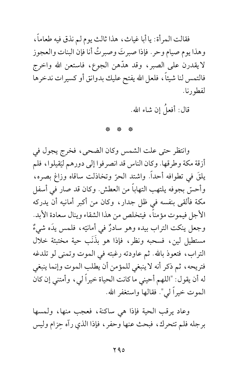 وانتظر حتى علت الشمس وكان الضحى، فخرج يجول في أزقة مكة وطرقها. وكان الناس قد انصرفوا إلى دورهم ليَقيلوا، فلم يلقَ في تطوافه أحداً. واشتد الحرّ وتخاذلت ساقاه وزاغ بصره، وأحسّ بجوفه يلتهب التهاباً من العطش. وكان قد صار في أسفل مكة فألقى بنفسه في ظل جدار، وكان من أكبر أمانيه أن يدركه الأجل فيموت مؤمناً، فيتخلص من هذا الشقاء وينال سعادة الأبد. وجعل ينكت التراب بيده وهو سادرٌ في أمانيّه، فلمس يدَه شيءٌ مستطيل لين، فسحبه ونظر، فإذا هو بذَنَب حية مختبئة خلال التراب، فتعوذ بالله. ثم عاودته رغبته في الموت وتمنى لو تلدغه فتريحه، ثم ذكر أنه لا ينبغي للمؤمن أن يطلب الموت وإنما ينبغي له أن يقول: "اللهم أحيني ما كانت الحياة خيراً لي، وأمتني إن كان الموت خيراً لي". فقالها واستغفر الله.