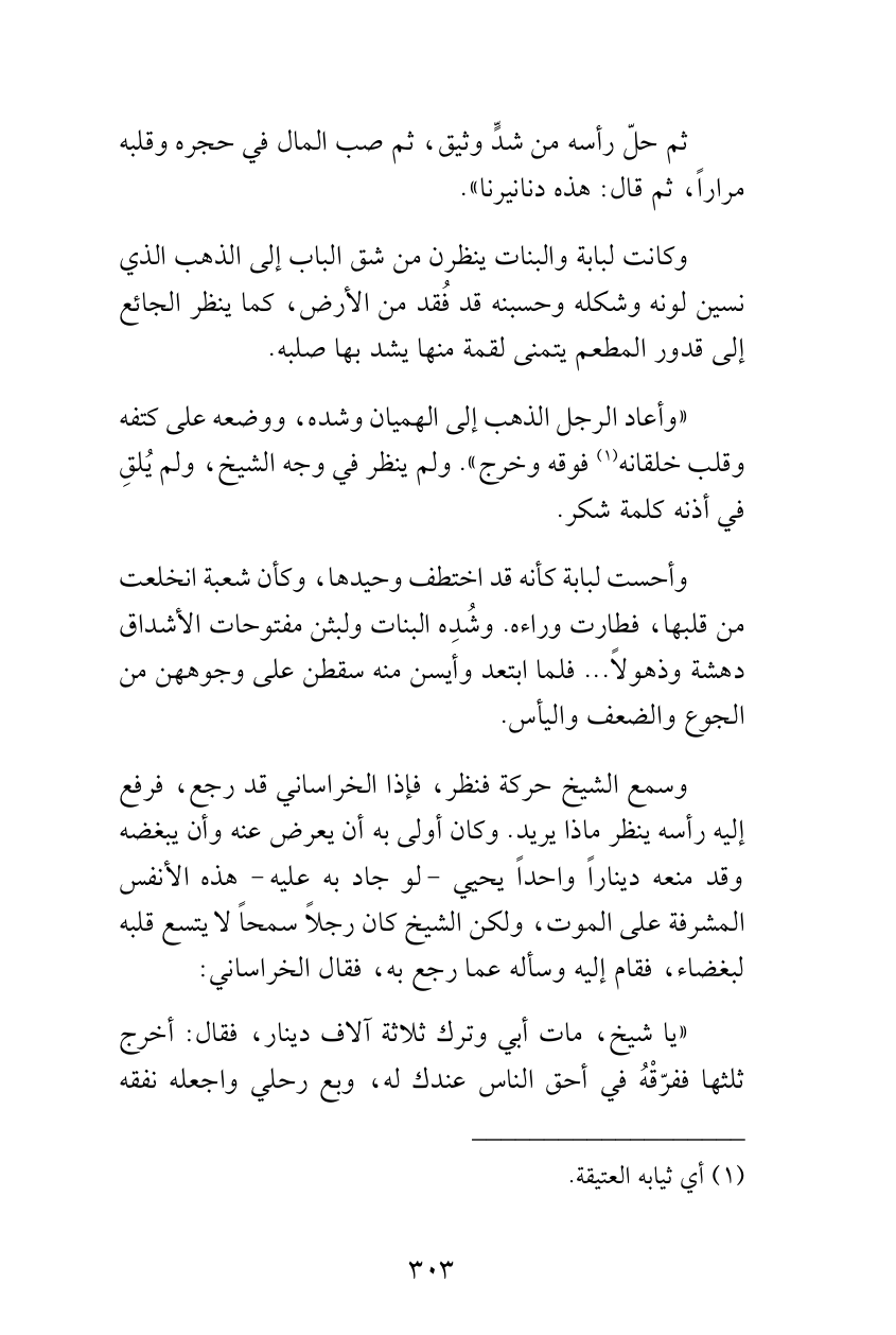 «وأعاد الرجل الذهب إلى الهميان وشده، ووضعه على كتفه وقلب خلقانه (¬1) فوقه وخرج». ولم ينظر في وجه الشيخ، ولم يُلقِ في أذنه كلمة شكر.