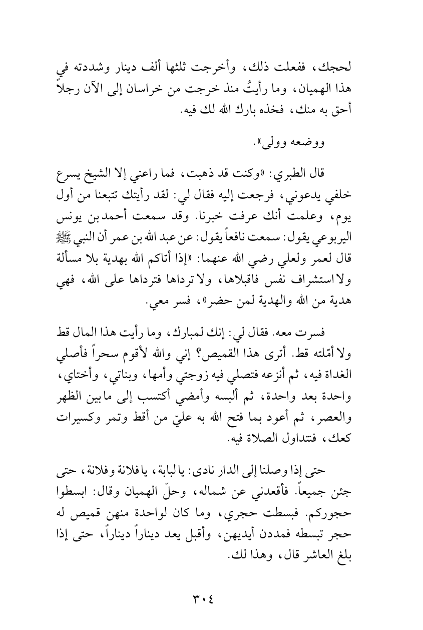 لحجك، ففعلت ذلك، وأخرجت ثلثها ألف دينار وشددته في هذا الهميان، وما رأيتُ منذ خرجت من خراسان إلى الآن رجلاً أحق به منك، فخذه بارك الله لك فيه.