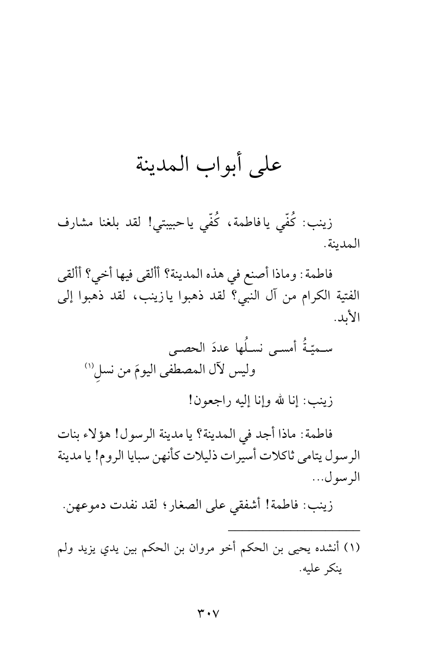 فاطمة: وماذا أصنع في هذه المدينة؟ أألقى فيها أخي؟ أألقى الفتية الكرام من آل النبي؟ لقد ذهبوا يا زينب، لقد ذهبوا إلى الأبد.
