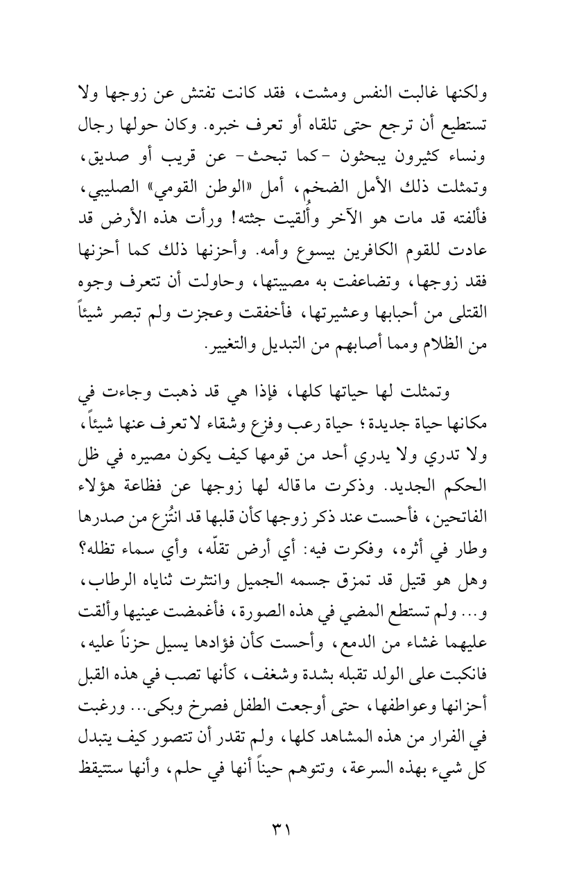 ولكنها غالبت النفس ومشت، فقد كانت تفتش عن زوجها ولا تستطيع أن ترجع حتى تلقاه أو تعرف خبره. وكان حولها رجال ونساء كثيرون يبحثون - كما تبحث - عن قريب أو صديق، وتمثلت ذلك الأمل الضخم، أمل «الوطن القومي» الصليبي، فألفته قد مات هو الآخر وأُلقيت جثته! ورأت هذه الأرض قد عادت للقوم الكافرين بيسوع وأمه. وأحزنها ذلك كما أحزنها فقد زوجها، وتضاعفت به مصيبتها، وحاولت أن تتعرف وجوه القتلى من أحبابها وعشيرتها، فأخفقت وعجزت ولم تبصر شيئاً من الظلام ومما أصابهم من التبديل والتغيير.