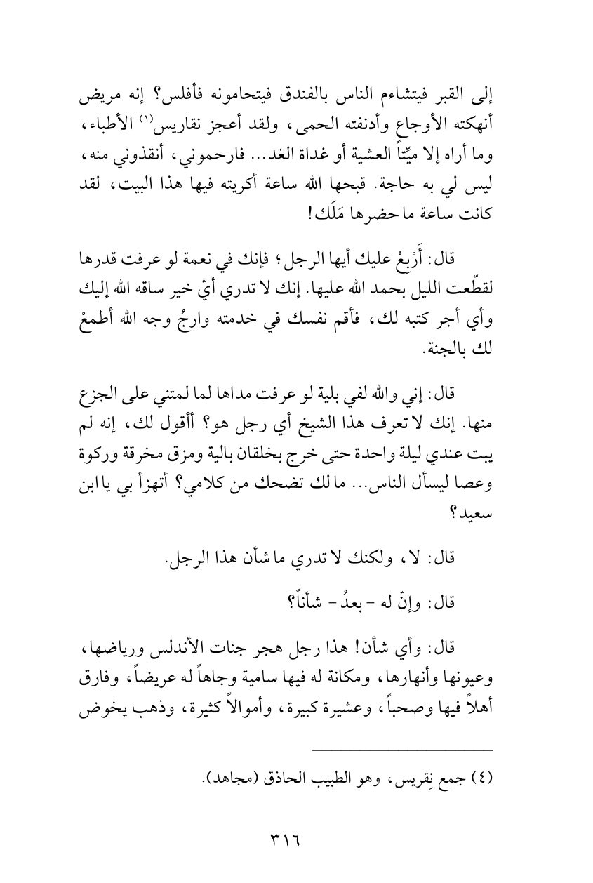 قال: إني والله لفي بلية لو عرفت مداها لما لمتني على الجزع منها. إنك لا تعرف هذا الشيخ أي رجل هو؟ أأقول لك، إنه لم يبت عندي ليلة واحدة حتى خرج بخلقان بالية ومزق مخرقة وركوة وعصا ليسأل الناس ... ما لك تضحك من كلامي؟ أتهزأ بي يا ابن سعيد؟