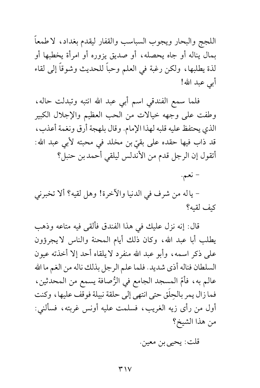 فلما سمع الفندقي اسم أبي عبد الله انتبه وتبدلت حاله، وطفت على وجهه خيالات من الحب العظيم والإجلال الكبير الذي يحتفظ عليه قلبه لهذا الإمام. وقال بلهجة أرق ونغمة أعذب، قد ذاب فيها حقده على بقيّ بن مخلد في محبته لأبي عبد الله: أتقول إن الرجل قدم من الأندلس ليلقي أحمد بن حنبل؟