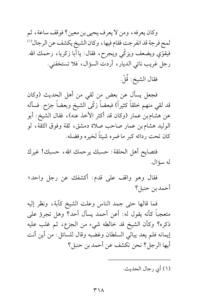 فما قالها حتى جمد الناس وعلت الشيخ كآبة، ونظر إليه متعجباً كأنه يقول له: أعن أحمد يسأل أحد؟ وهل تجرؤ على ذكره؟ وكأن الشيخ قد خالطه شيء من الجزع، ثم غلب عليه إيمانه فلم يعد يبالي السلطان وغضبه وقال للسائل: من أين أنت أيها الرجل؟ نحن نكشف عن أحمد بن حنبل؟