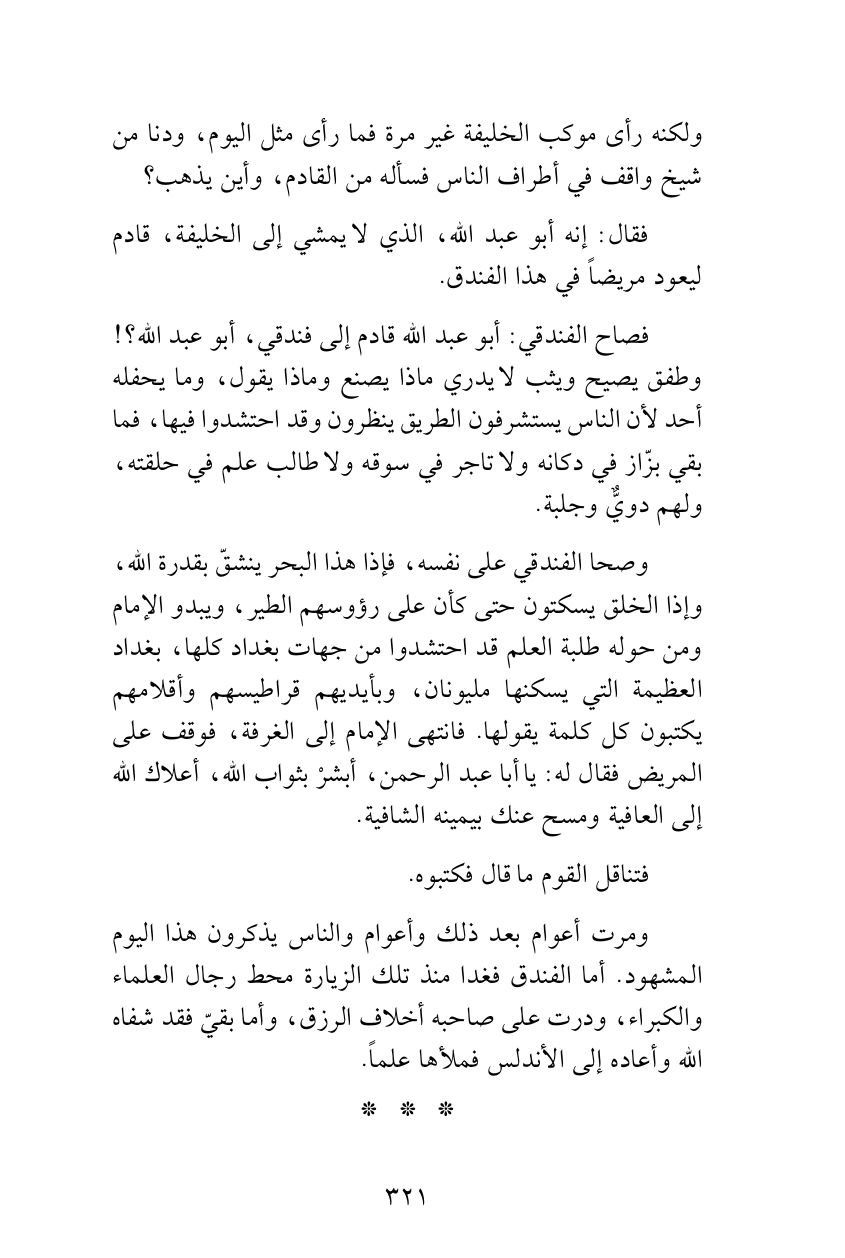 وصحا الفندقي على نفسه، فإذا هذا البحر ينشقّ بقدرة الله، وإذا الخلق يسكتون حتى كأن على رؤوسهم الطير، ويبدو الإمام ومن حوله طلبة العلم قد احتشدوا من جهات بغداد كلها، بغداد العظيمة التي يسكنها مليونان، وبأيديهم قراطيسهم وأقلامهم يكتبون كل كلمة يقولها. فانتهى الإمام إلى الغرفة، فوقف على المريض فقال له: يا أبا عبد الرحمن، أبشرْ بثواب الله، أعلاك الله إلى العافية ومسح عنك بيمينه الشافية.