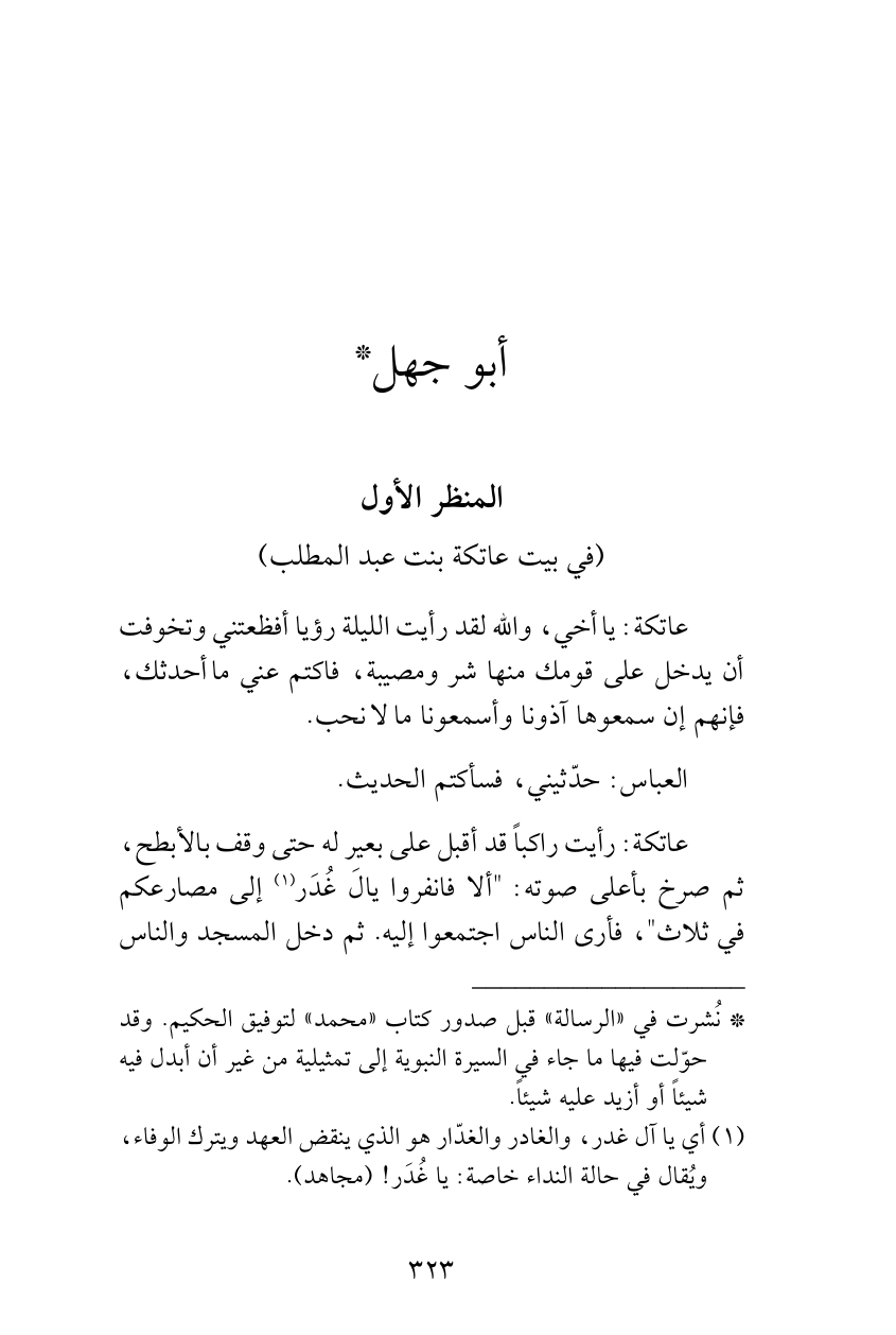 (¬*) نُشرت في «الرسالة» قبل صدور كتاب «محمد» لتوفيق الحكيم. وقد حوّلت فيها ما جاء في السيرة النبوية إلى تمثيلية من غير أن أبدل فيه شيئاً أو أزيد عليه شيئاً.
