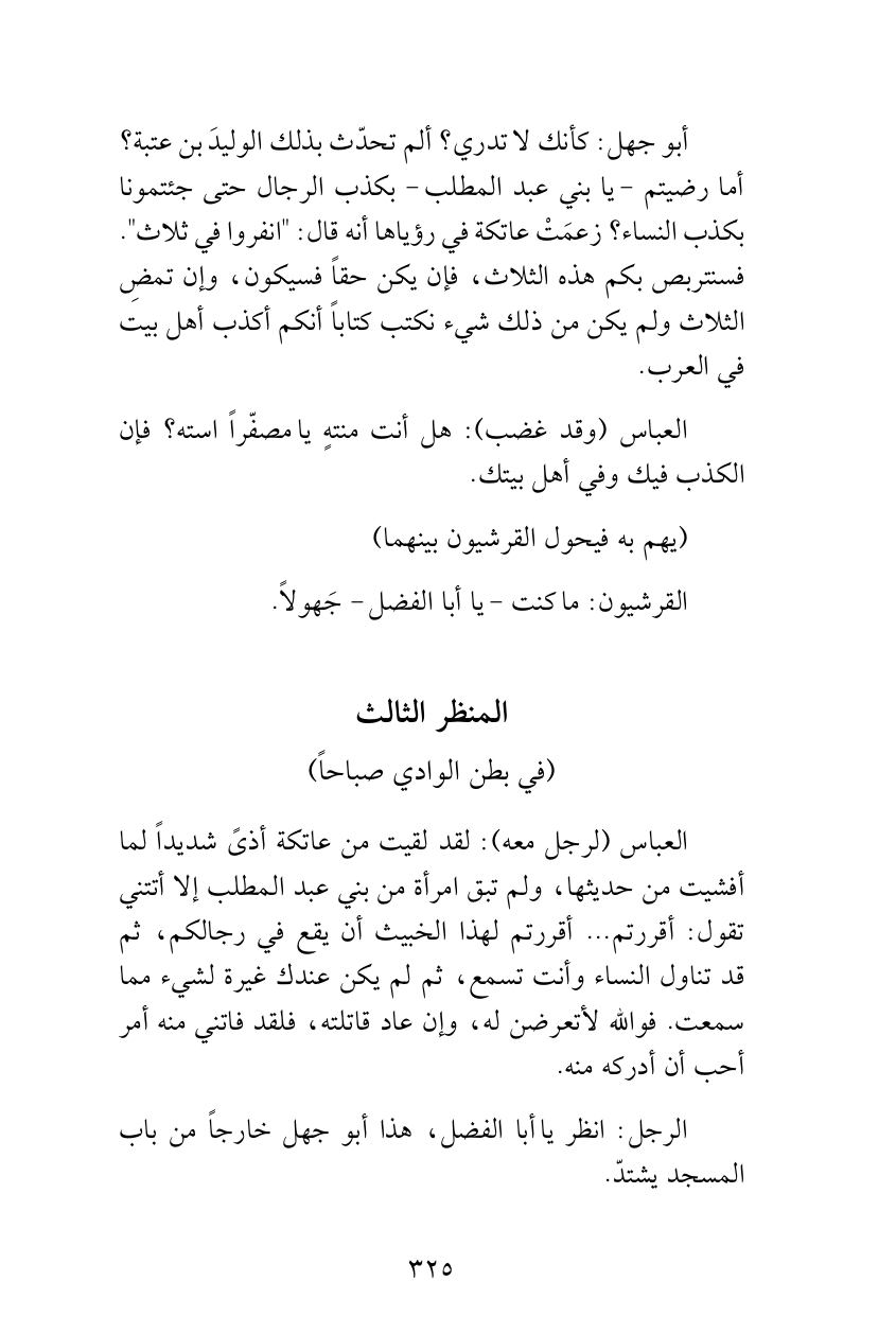 أبو جهل: كأنك لا تدري؟ ألم تحدّث بذلك الوليدَ بن عتبة؟ أما رضيتم - يا بني عبد المطلب - بكذب الرجال حتى جئتمونا بكذب النساء؟ زعمَتْ عاتكة في رؤياها أنه قال: "انفروا في ثلاث". فسنتربص بكم هذه الثلاث، فإن يكن حقاً فسيكون، وإن تمضِ الثلاث ولم يكن من ذلك شيء نكتب كتاباً أنكم أكذب أهل بيت في العرب.