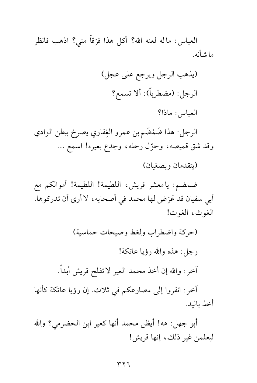 أبو جهل: هه! أيظن محمد أنها كعير ابن الحضرمي؟ والله ليعلمن غير ذلك، إنها قريش!