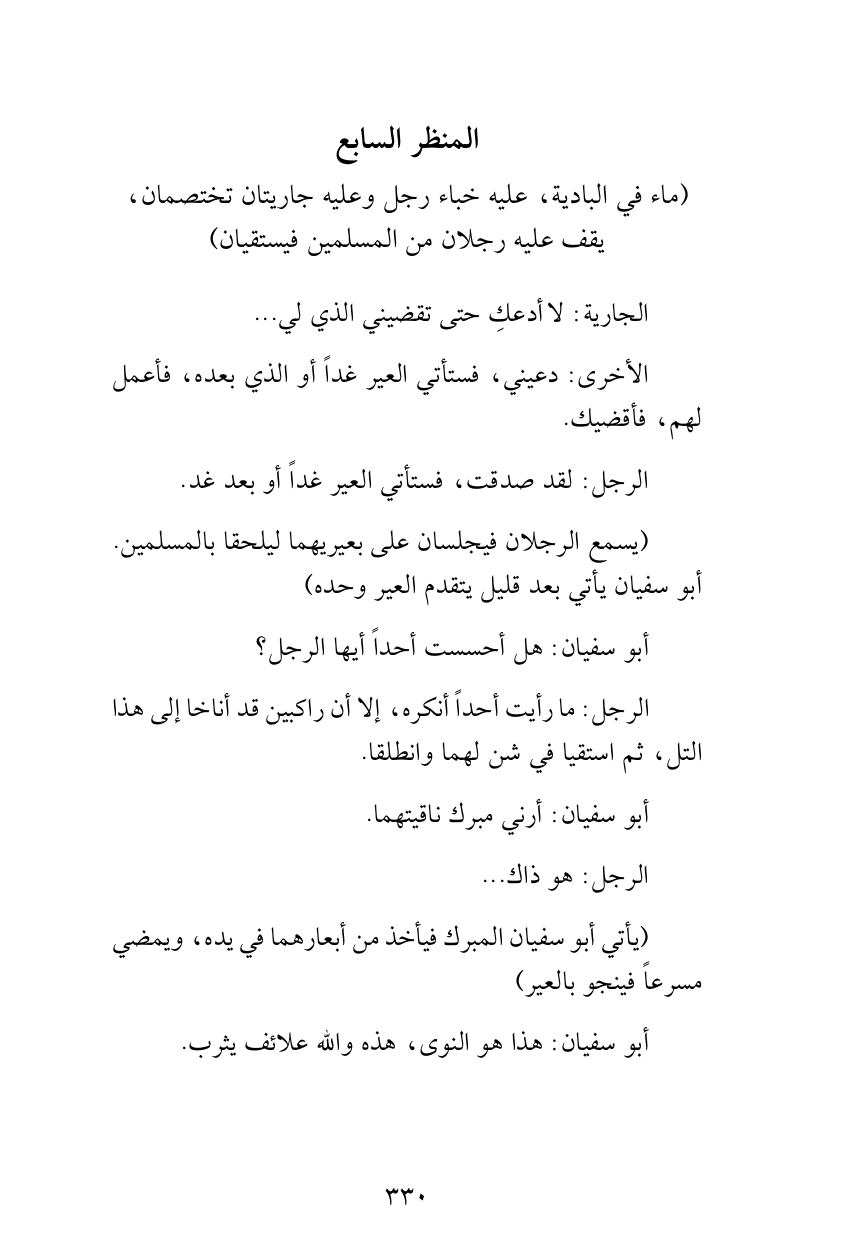 (يسمع الرجلان فيجلسان على بعيريهما ليلحقا بالمسلمين. أبو سفيان يأتي بعد قليل يتقدم العير وحده)