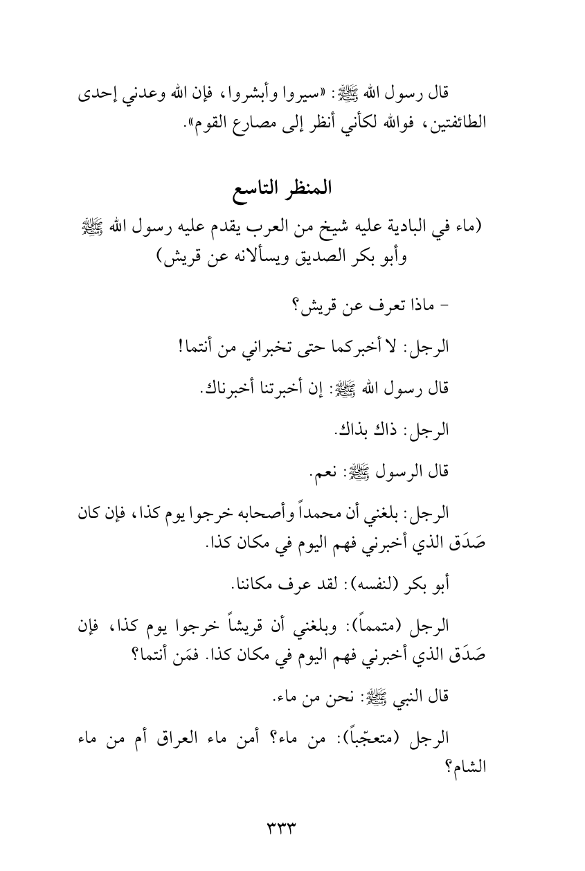 (ماء في البادية عليه شيخ من العرب يقدم عليه رسول الله صلى الله عليه وسلم وأبو بكر الصديق ويسألانه عن قريش)