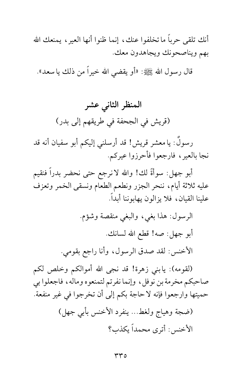 أبو جهل: سوأةً لك! والله لا نرجع حتى نحضر بدراً فنقيم عليه ثلاثة أيام، ننحر الجزر ونطعم الطعام ونسقى الخمر وتعزف علينا القيان، فلا يزالون يهابوننا أبداً.