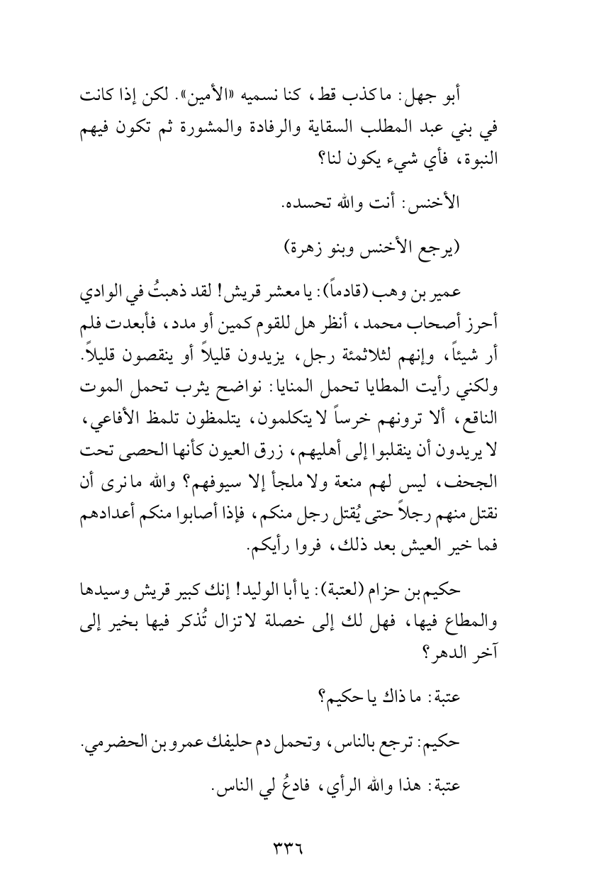 أبو جهل: ما كذب قط، كنا نسميه «الأمين». لكن إذا كانت في بني عبد المطلب السقاية والرفادة والمشورة ثم تكون فيهم النبوة، فأي شيء يكون لنا؟