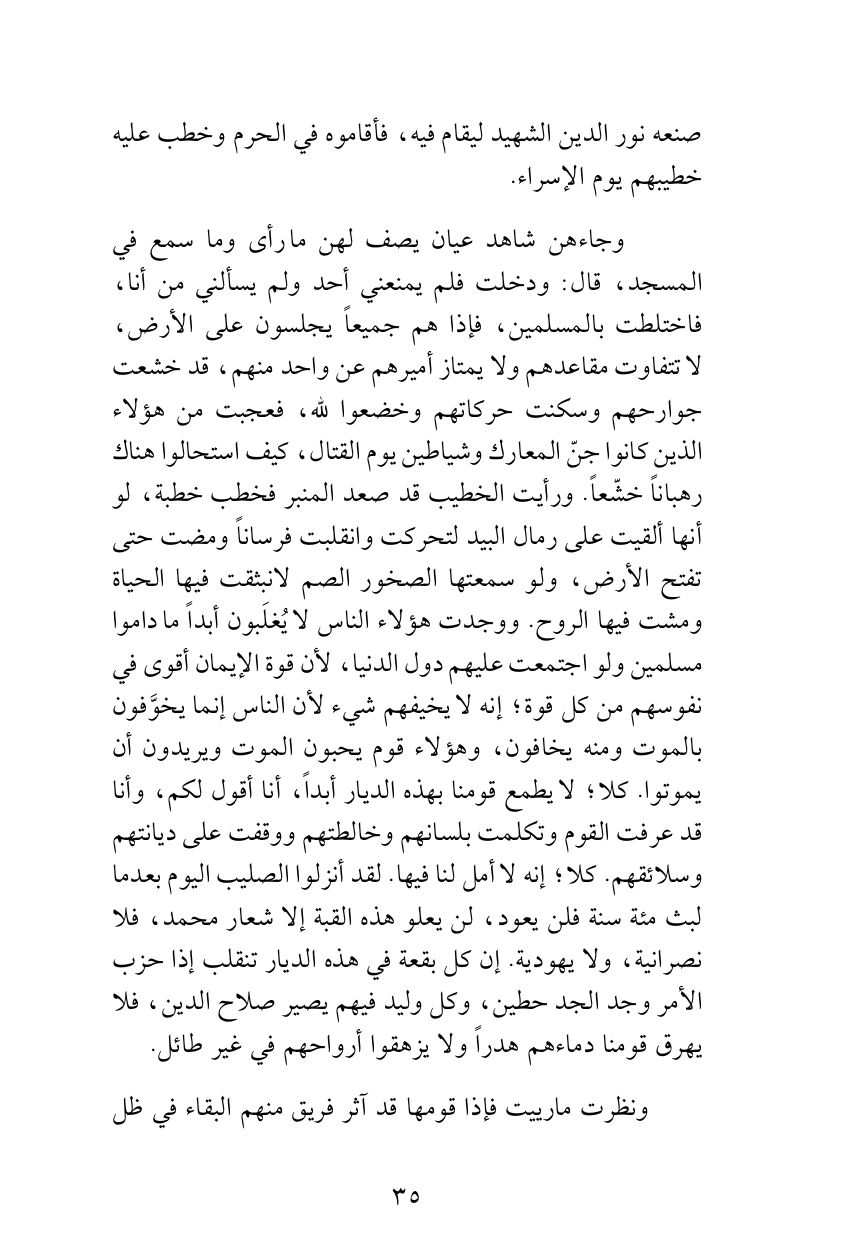 وجاءهن شاهد عيان يصف لهن ما رأى وما سمع في المسجد، قال: ودخلت فلم يمنعني أحد ولم يسألني من أنا، فاختلطت بالمسلمين، فإذا هم جميعاً يجلسون على الأرض، لا تتفاوت مقاعدهم ولا يمتاز أميرهم عن واحد منهم، قد خشعت جوارحهم وسكنت حركاتهم وخضعوا لله، فعجبت من هؤلاء الذين كانوا جنّ المعارك وشياطين يوم القتال، كيف استحالوا هناك رهباناً خشّعاً. ورأيت الخطيب قد صعد المنبر فخطب خطبة، لو أنها ألقيت على رمال البيد لتحركت وانقلبت فرساناً ومضت حتى تفتح الأرض، ولو سمعتها الصخور الصم لانبثقت فيها الحياة ومشت فيها الروح. ووجدت هؤلاء الناس لا يُغلَبون أبداً ما داموا مسلمين ولو اجتمعت عليهم دول الدنيا، لأن قوة الإيمان أقوى في نفوسهم من كل قوة؛ إنه لا يخيفهم شيء لأن الناس إنما يخوَّفون بالموت ومنه يخافون، وهؤلاء قوم يحبون الموت ويريدون أن يموتوا. كلا؛ لا يطمع قومنا بهذه الديار أبداً، أنا أقول لكم، وأنا قد عرفت القوم وتكلمت بلسانهم وخالطتهم ووقفت على ديانتهم وسلائقهم. كلا؛ إنه لا أمل لنا فيها. لقد أنزلوا الصليب اليوم بعدما لبث مئة سنة فلن يعود، لن يعلو هذه القبة إلا شعار محمد، فلا نصرانية، ولا يهودية. إن كل بقعة في هذه الديار تنقلب إذا حزب الأمر وجد الجد حطين، وكل وليد فيهم يصير صلاح الدين، فلا يهرق قومنا دماءهم هدراً ولا يزهقوا أرواحهم في غير طائل.
