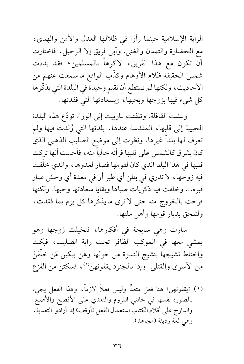 الراية الإسلامية حينما رأوا في ظلالها العدل والأمن والهدى، مع الحضارة والتمدن والغنى. وأبى فريق إلا الرحيل، فاختارت أن تكون مع هذا الفريق، لا كرهاً بالمسلمين؛ فقد بددت شمس الحقيقة ظلام الأوهام وكذّب الواقع ما سمعت عنهم من الأحاديث، ولكنها لم تستطع أن تقيم وحيدة في البلدة التي يذكّرها كل شيء فيها بزوجها وبحبها، وبسعادتها التي فقدتها.
