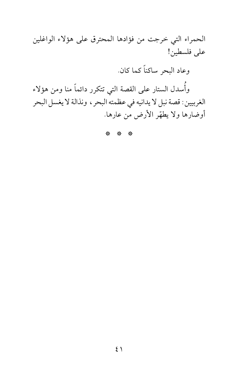وأُسدل الستار على القصة التي تتكرر دائماً منا ومن هؤلاء الغربيين: قصة نبل لا يدانيه في عظمته البحر، ونذالة لا يغسل البحر أوضارها ولا يطهّر الأرض من عارها.