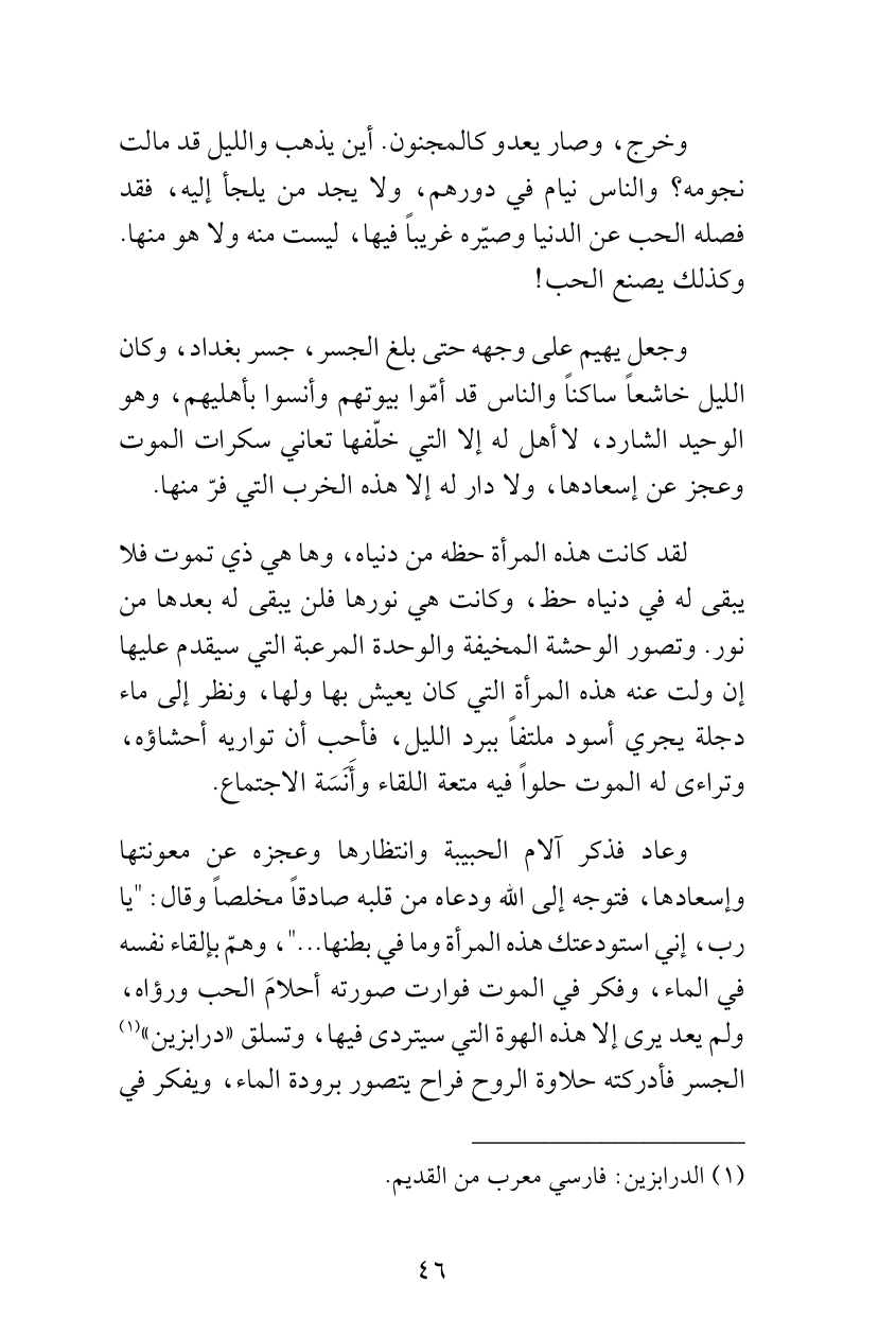 وجعل يهيم على وجهه حتى بلغ الجسر، جسر بغداد، وكان الليل خاشعاً ساكناً والناس قد أمّوا بيوتهم وأنسوا بأهليهم، وهو الوحيد الشارد، لا أهل له إلا التي خلّفها تعاني سكرات الموت وعجز عن إسعادها، ولا دار له إلا هذه الخرب التي فرّ منها.