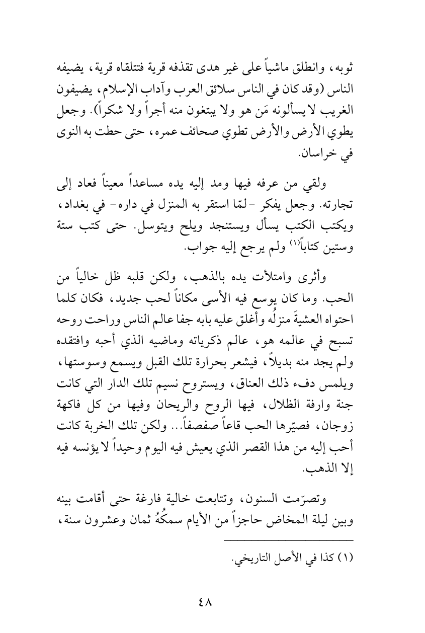 ثوبه، وانطلق ماشياً على غير هدى تقذفه قرية فتتلقاه قرية، يضيفه الناس (وقد كان في الناس سلائق العرب وآداب الإسلام، يضيفون الغريب لا يسألونه مَن هو ولا يبتغون منه أجراً ولا شكراً). وجعل يطوي الأرض والأرض تطوي صحائف عمره، حتى حطت به النوى في خراسان.
