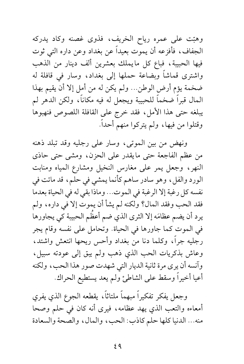 ونهض من بين الموتى، وسار على رجليه وقد تبلد ذهنه من عظم الفاجعة حتى ما يقدر على الحزن، ومشى حتى حاذى النهر، وجعل يمر على مغارس النخيل ومشارع المياه ومنابت الورد والفل، وهو سادر ساهم كأنما يمشي في حلم، قد ماتت في نفسه كل رغبة إلا الرغبة في الموت ... وماذا بقي له في الحياة بعدما فقد الحب وفقد المال؟ ولكنه لم يشأ أن يموت إلا في داره، ولم يرد أن يضم عظامَه إلا الثرى الذي ضم أعظُم الحبيبة كي يجاورها في الموت كما جاورها في الحياة. وتحامل على نفسه وقام يجر رجليه جراً، وكلما دنا من بغداد وأحس ريحها انتعش واشتد، وعاش بذكريات الحب الذي ذهب ولم يبق إلى عودته سبيل، وآنسه أن يرى مرة ثانية الديار التي شهدت صور هذا الحب، ولكنه أعيا أخيراً وسقط على الشاطئ ولم يعد يستطيع الحراك.