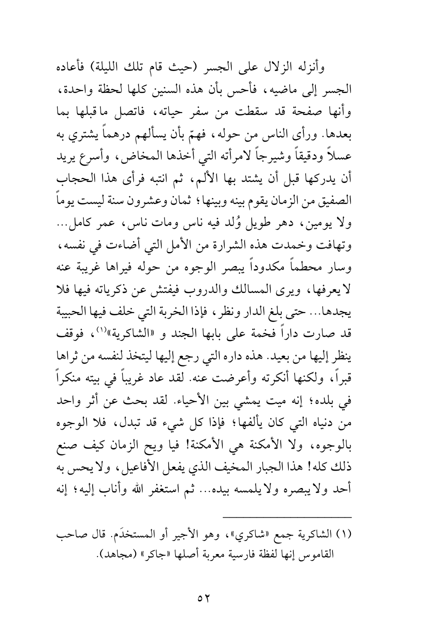 وأنزله الزلال على الجسر (حيث قام تلك الليلة) فأعاده الجسر إلى ماضيه، فأحس بأن هذه السنين كلها لحظة واحدة، وأنها صفحة قد سقطت من سفر حياته، فاتصل ما قبلها بما بعدها. ورأى الناس من حوله، فهمّ بأن يسألهم درهماً يشتري به عسلاً ودقيقاً وشيرجاً لامرأته التي أخذها المخاض، وأسرع يريد أن يدركها قبل أن يشتد بها الألم، ثم انتبه فرأى هذا الحجاب الصفيق من الزمان يقوم بينه وبينها؛ ثمان وعشرون سنة ليست يوماً ولا يومين، دهر طويل وُلد فيه ناس ومات ناس، عمر كامل ... وتهافت وخمدت هذه الشرارة من الأمل التي أضاءت في نفسه، وسار محطماً مكدوداً يبصر الوجوه من حوله فيراها غريبة عنه لا يعرفها، ويرى المسالك والدروب فيفتش عن ذكرياته فيها فلا يجدها ... حتى بلغ الدار ونظر، فإذا الخربة التي خلف فيها الحبيبة قد صارت داراً فخمة على بابها الجند و «الشاكرية» (¬1)، فوقف ينظر إليها من بعيد. هذه داره التي رجع إليها ليتخذ لنفسه من ثراها قبراً، ولكنها أنكرته وأعرضت عنه. لقد عاد غريباً في بيته منكراً في بلده؛ إنه ميت يمشي بين الأحياء. لقد بحث عن أثر واحد من دنياه التي كان يألفها؛ فإذا كل شيء قد تبدل، فلا الوجوه بالوجوه، ولا الأمكنة هي الأمكنة! فيا ويح الزمان كيف صنع ذلك كله! هذا الجبار المخيف الذي يفعل الأفاعيل، ولا يحس به أحد ولا يبصره ولا يلمسه بيده ... ثم استغفر الله وأناب إليه؛ إنه