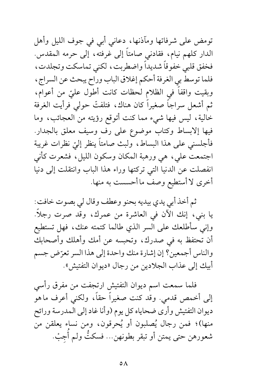 تومض على شرفاتها ومآذنها، دعاني أبي في جوف الليل وأهل الدار كلهم نيام، فقادني صامتاً إلى غرفته، إلى حرمه المقدس. فخفق قلبي خفوقاً شديداً واضطربت، لكني تماسكت وتجلدت، فلما توسط بي الغرفة أحكم إغلاق الباب وراح يبحث عن السراج، وبقيت واقفاً في الظلام لحظات كانت أطول عليّ من أعوام، ثم أشعل سراجاً صغيراً كان هناك، فتلفتّ حولي فرأيت الغرفة خالية، ليس فيها شيء مما كنت أتوقع رؤيته من العجائب، وما فيها إلابساط وكتاب موضوع على رف وسيف معلق بالجدار. فأجلسني على هذا البساط، ولبث صامتاً ينظر إليّ نظرات غريبة اجتمعت علي، هي ورهبة المكان وسكون الليل، فشعرت كأني انفصلت عن الدنيا التي تركتها وراء هذا الباب وانتقلت إلى دنيا أخرى لا أستطيع وصف ما أحسست به منها.