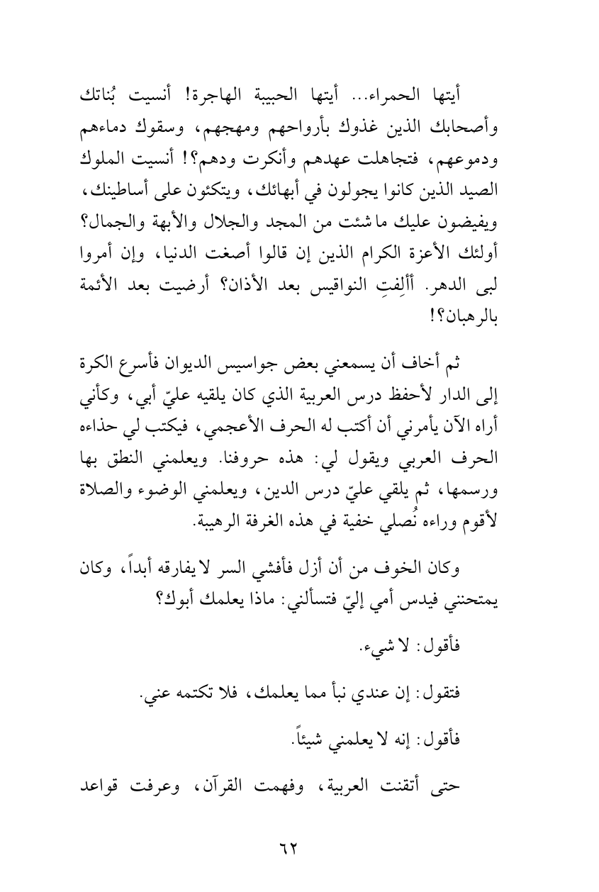 ثم أخاف أن يسمعني بعض جواسيس الديوان فأسرع الكرة إلى الدار لأحفظ درس العربية الذي كان يلقيه عليّ أبي، وكأني أراه الآن يأمرني أن أكتب له الحرف الأعجمي، فيكتب لي حذاءه الحرف العربي ويقول لي: هذه حروفنا. ويعلمني النطق بها ورسمها، ثم يلقي عليّ درس الدين، ويعلمني الوضوء والصلاة لأقوم وراءه نُصلي خفية في هذه الغرفة الرهيبة.