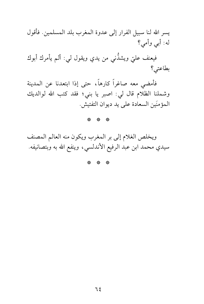 يسر الله لنا سبيل الفرار إلى عدوة المغرب بلد المسلمين. فأقول له: أبي وأمي؟