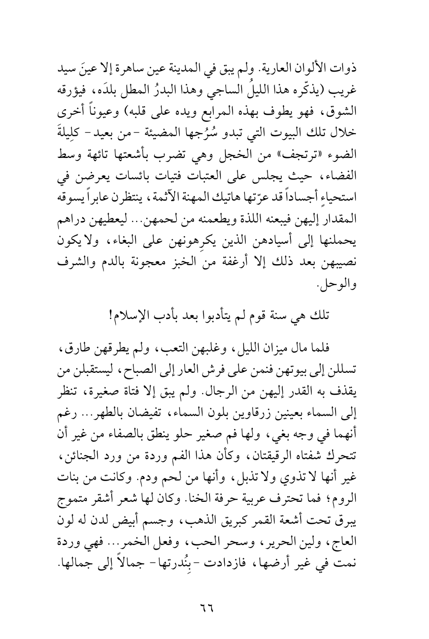 ذوات الألوان العارية. ولم يبق في المدينة عين ساهرة إلا عينَ سيد غريب (يذكّره هذا الليلُ الساجي وهذا البدرُ المطل بلدَه، فيؤرقه الشوق، فهو يطوف بهذه المرابع ويده على قلبه) وعيوناً أخرى خلال تلك البيوت التي تبدو سُرُجها المضيئة - من بعيد - كلِيلةَ الضوء «ترتجف» من الخجل وهي تضرب بأشعتها تائهة وسط الفضاء، حيث يجلس على العتبات فتيات بائسات يعرضن في استحياءٍ أجساداً قد عرّتها هاتيك المهنة الآثمة، ينتظرن عابراً يسوقه المقدار إليهن فيبعنه اللذة ويطعمنه من لحمهن ... ليعطيهن دراهم يحملنها إلى أسيادهن الذين يكرِهونهن على البغاء، ولا يكون نصيبهن بعد ذلك إلا أرغفة من الخبز معجونة بالدم والشرف والوحل.