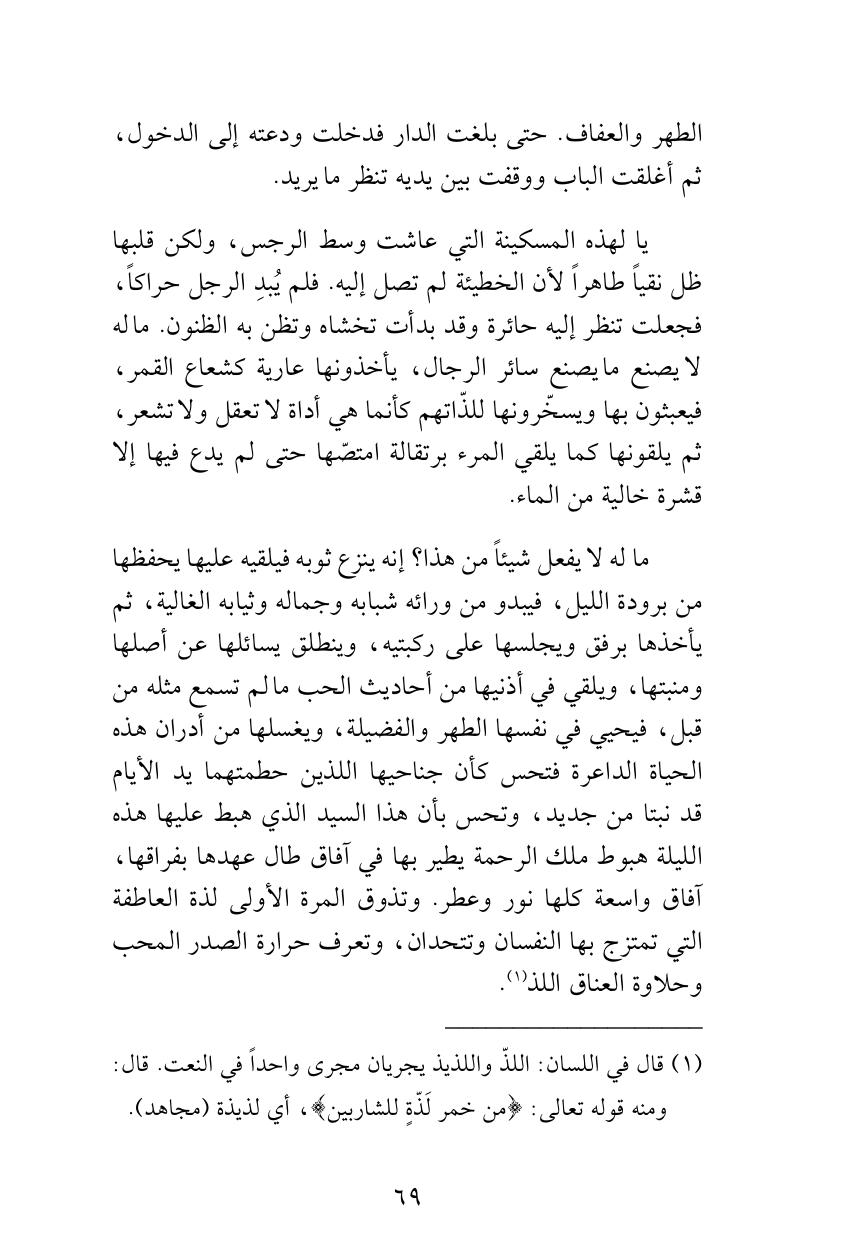 الطهر والعفاف. حتى بلغت الدار فدخلت ودعته إلى الدخول، ثم أغلقت الباب ووقفت بين يديه تنظر ما يريد.
