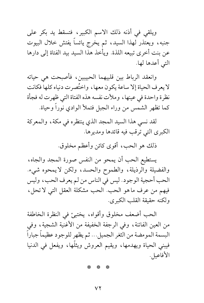 وانعقد الرباط بين قلبيهما الحبيبين، فأصبحت هي حياته لا يعرف الحياة إلا ساعة يكون معها، واختُصرت دنياه كلها فكانت نظرة واحدة في عينها، وملأت نفسه هذه الفتاة التي ظهرت له فجأة كما تظهر الشمس من وراء الجبل فتملأ الوادي نوراً وحياة.