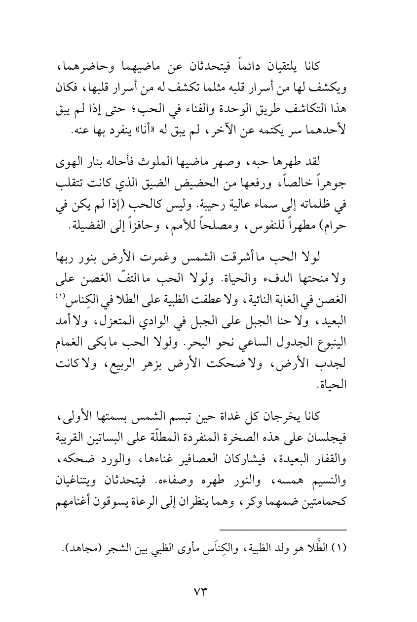 لولا الحب ما أشرقت الشمس وغمرت الأرض بنور ربها ولا منحتها الدفء والحياة. ولولا الحب ما التفّ الغصن على الغصن في الغابة النائية، ولا عطفت الظبية على الطلا في الكِناس (¬1) البعيد، ولا حنا الجبل على الجبل في الوادي المتعزل، ولا أمد الينبوع الجدول الساعي نحو البحر. ولولا الحب ما بكى الغمام لجدب الأرض، ولا ضحكت الأرض بزهر الربيع، ولا كانت الحياة.