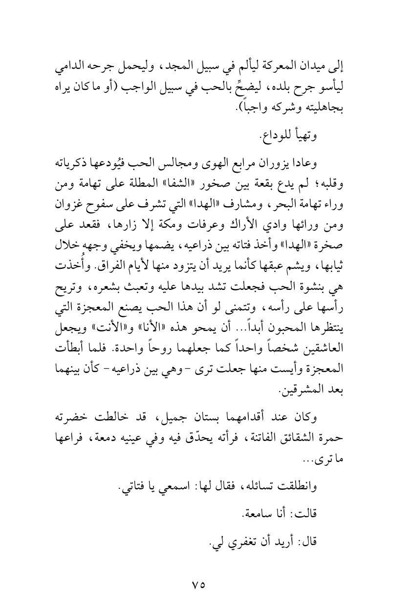 وعادا يزوران مرابع الهوى ومجالس الحب فيُودعها ذكرياته وقلبه؛ لم يدع بقعة بين صخور «الشفا» المطلة على تهامة ومن وراء تهامة البحر، ومشارف «الهدا» التي تشرف على سفوح غزوان ومن ورائها وادي الأراك وعرفات ومكة إلا زارها، فقعد على صخرة «الهدا» وأخذ فتاته بين ذراعيه، يضمها ويخفي وجهه خلال ثيابها، ويشم عبقها كأنما يريد أن يتزود منها لأيام الفراق. وأُخذت هي بنشوة الحب فجعلت تشد بيدها عليه وتعبث بشعره، وتريح رأسها على رأسه، وتتمنى لو أن هذا الحب يصنع المعجزة التي ينتظرها المحبون أبداً ... أن يمحو هذه «الأنا» و «الأنت» ويجعل العاشقين شخصاً واحداً كما جعلهما روحاً واحدة. فلما أبطأت المعجزة وأيست منها جعلت ترى - وهي بين ذراعيه - كأن بينهما بعد المشرقين.
