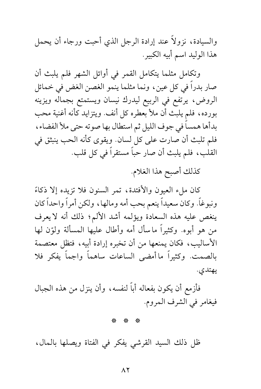 كان ملء العيون والأفئدة، تمر السنون فلا تزيده إلا ذكاءً ونبوغاً. وكان سعيداً ينعم بحب أمه ومالها، ولكن أمراً واحداً كان ينغص عليه هذه السعادة ويؤلمه أشد الألم؛ ذلك أنه لا يعرف من هو أبوه. وكثيراً ما سأل أمه وأطال عليها المسألة ولوّن لها الأساليب، فكان يمنعها من أن تخبره إرادة أبيه، فتظل معتصمة بالصمت. وكثيراً ما أمضى الساعات ساهماً واجماً يفكر فلا يهتدي.