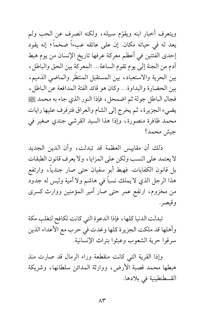 ويتعرف أخبار ابنه ويقوّم سبيله، ولكنه انصرف عن الحب ولم يعد له في حياته مكان. إن على عاتقه عبءاً ضخماً؛ إنه يقود إحدى الفئتين في أعظم معركة عرفها تاريخ الإنسان من يوم هبط آدم من الجنة إلى يوم تقوم الساعة ... المعركة بين الحق والباطل، بين الحرية والاستعباد، بين المستقبل المنتظَر والماضي الذميم، بين الحضارة والبداوة ... وكان هو قائد الفئة المدافعة عن الباطل، فجال الباطل جولة ثم اضمحل، فإذا النور الذي جاء به محمد صلى الله عليه وسلم يضيء الجزيرة، ثم يخرج إلى الشام والعراق فترفرف عليها رايات محمد ظافرة منصورة، وإذا هذا السيد القرشي جندي صغير في جيش محمد!