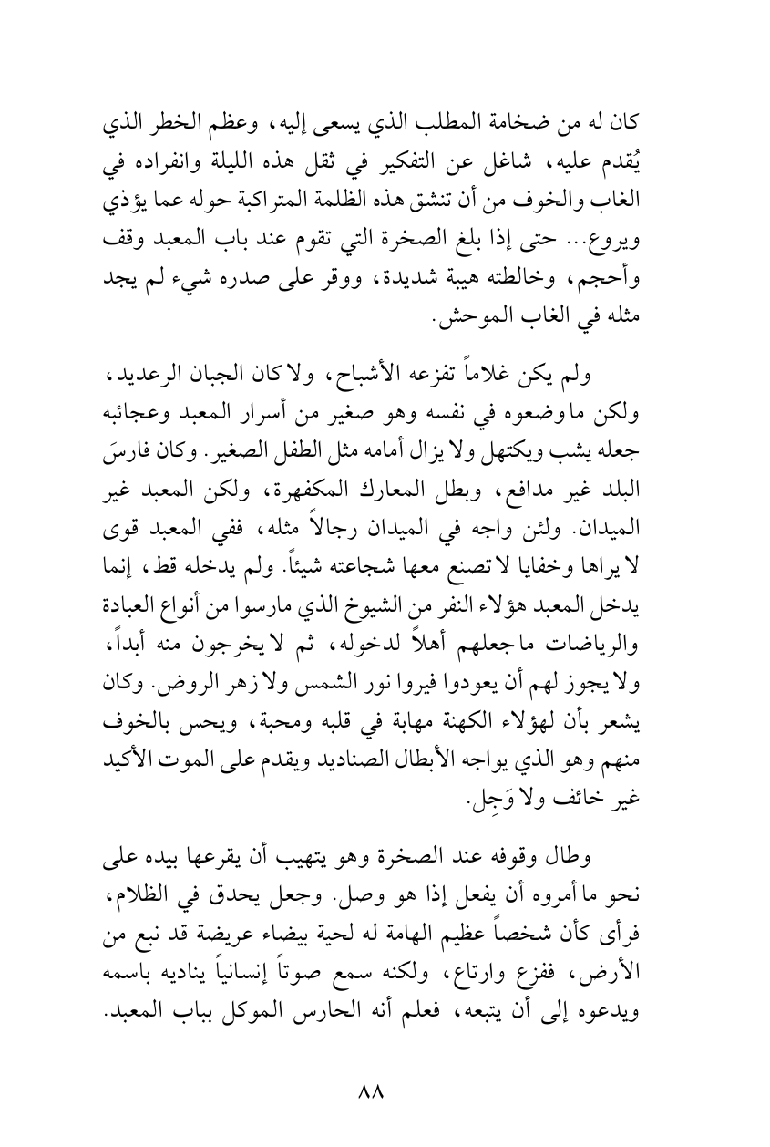 ولم يكن غلاماً تفزعه الأشباح، ولا كان الجبان الرعديد، ولكن ما وضعوه في نفسه وهو صغير من أسرار المعبد وعجائبه جعله يشب ويكتهل ولا يزال أمامه مثل الطفل الصغير. وكان فارسَ البلد غير مدافع، وبطل المعارك المكفهرة، ولكن المعبد غير الميدان. ولئن واجه في الميدان رجالاً مثله، ففي المعبد قوى لا يراها وخفايا لا تصنع معها شجاعته شيئاً. ولم يدخله قط، إنما يدخل المعبد هؤلاء النفر من الشيوخ الذي مارسوا من أنواع العبادة والرياضات ما جعلهم أهلاً لدخوله، ثم لا يخرجون منه أبداً، ولا يجوز لهم أن يعودوا فيروا نور الشمس ولا زهر الروض. وكان يشعر بأن لهؤلاء الكهنة مهابة في قلبه ومحبة، ويحس بالخوف منهم وهو الذي يواجه الأبطال الصناديد ويقدم على الموت الأكيد غير خائف ولا وَجِل.