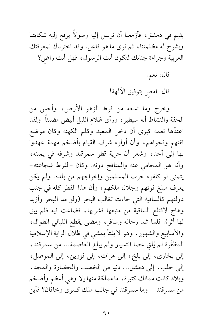 وخرج وما تسعه من فرط الزهو الأرض، وأحس من الخفة والنشاط أنه سيطير، ورأى ظلام الليل أبيض مضيئاً. ولقد اعتدّها نعمة كبرى أن دخل المعبد وكلم الكهنة وكان موضع ثقتهم ونجواهم، وأن أولوه شرف القيام بأضخم مهمة عهدوا بها إلى أحد، وشعر أن حرية قطر سمرقند وشرفه في يمينه، وأنه هو المحامي عنه والمنافح دونه. وكان - لفرط شجاعته - يتمنى لو كلفوه حرب المسلمين وإخراجهم من بلده. ولم يكن يعرف مبلغ قوتهم وجلال ملكهم، وأن هذا القطر كله في جنب دولتهم كالساقية التي جاءت تغالب البحر (ولو مد البحر وأزبد وهاج لاقتلع الساقية من منبعها فشربها، فضاعت فيه فلم يبق لها أثر). فلما شد رحاله وسافر، ومضى يقطع الليالي الطوال، والأسابيع والشهور، وهو لا يفتأ يمشي في ظلال الراية الإسلامية المظفّرة لم يُلقِ عصا التسيار ولم يبلغ العاصمة ... من سمرقند، إلى بخارى، إلى بلخ، إلى هرات، إلى قزوين، إلى الموصل، إلى حلب، إلى دمشق ... دنيا من الخصب والحضارة والمجد، وبلاد كانت ممالك كثيرة، ما مملكة منها إلا وهي أعظم وأضخم من سمرقند ... وما سمرقند في جانب ملك كسرى وخاقان؟ فأين