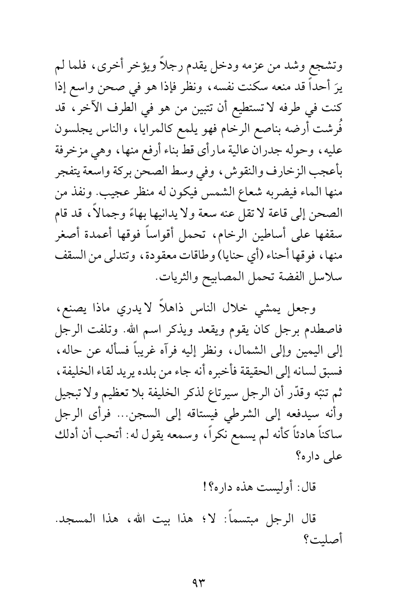 وتشجع وشد من عزمه ودخل يقدم رجلاً ويؤخر أخرى، فلما لم يرَ أحداً قد منعه سكنت نفسه، ونظر فإذا هو في صحن واسع إذا كنت في طرفه لا تستطيع أن تتبين من هو في الطرف الآخر، قد فُرشت أرضه بناصع الرخام فهو يلمع كالمرايا، والناس يجلسون عليه، وحوله جدران عالية ما رأى قط بناء أرفع منها، وهي مزخرفة بأعجب الزخارف والنقوش، وفي وسط الصحن بركة واسعة يتفجر منها الماء فيضربه شعاع الشمس فيكون له منظر عجيب. ونفذ من الصحن إلى قاعة لا تقل عنه سعة ولا يدانيها بهاءً وجمالاً، قد قام سقفها على أساطين الرخام، تحمل أقواساً فوقها أعمدة أصغر منها، فوقها أحناء (أي حنايا) وطاقات معقودة، وتتدلى من السقف سلاسل الفضة تحمل المصابيح والثريات.