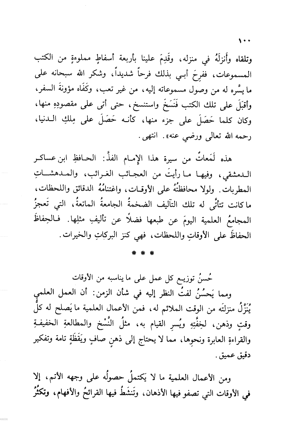 هذه لمعات من سيرة هذا الإمام الفذ: الحافظ ابن عساكر الدمشقي، وفيها ما رأيت من العجائب الغرائب، والمدهشات المطربات. ولولا محافظته على الأوقات، واغتنامه الدقائق واللحظات، ما كانت تتأتى له تلك التآليف الضخمة الجامعة الماتعة، التي تعجز المجامع العلمية اليوم عن طبعها فضلا عن تأليف مثلها. فالحفاظ الحفاظ على الأوقات واللحظات، فهي كنز البركات والخيرات.