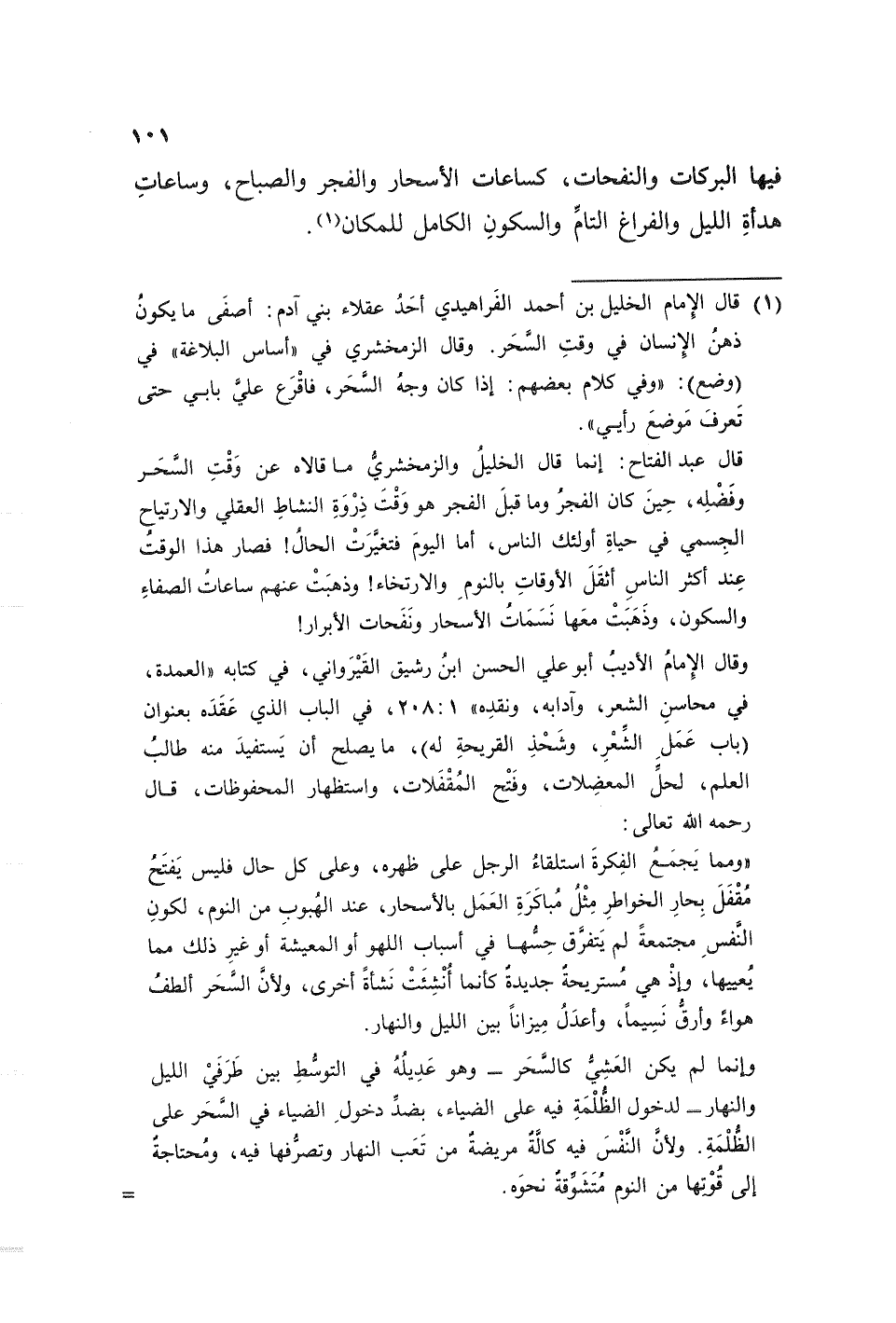 (¬1) قال الإمام الخليل بن أحمد الفراهيدي أحد عقلاء بني آدم: أصفى ما يكون ذهن الإنسان في وقت السحر. وقال الزمخشري في ((أساس البلاغة)) في (وضع): ((وفي كلام بعضهم: إذا كان وجه السحر، فاقرع علي بابي حتى تعرف موضع رأيي)). قال عبد الفتاح: إنما قال الخليل والزمخشري ما قالاه عن وقت السحر وفضله، حين كان الفجر وما قبل الفجر هو وقت ذروة النشاط العقلي والارتياح الجسمي في حياة أولئك الناس، أما اليوم فتغيرت الحال! فصار هذا الوقت عند أكثر الناس أثقل الأوقات بالنوم والارتخاء! وذهبت عنهم ساعات الصفاء والسكون، وذهبت معها نسمات الأسحار ونفحات الأبرار! وقال الإمام الأديب أبو علي الحسن ابن رشيق القيرواني، في كتابه ((العمدة، في محاسن الشعر، وآدابه، ونقده)) 208:1، في الباب الذي عقده بعنوان (باب عمل الشعر، وشحذ القريحة له)، ما يصلح أن يستفيد منه طالب العلم، لحل المعضلات، وفتح المقفلات، واستظهار المحفوظات، قال رحمه الله تعالى: ((ومما يجمع الفكرة استلقاء الرجل على ظهره، وعلى كل حال فليس يفتح مقفل بحار الخواطر مثل مباكرة العمل بالأسحار، عند الهبوب من النوم، لكون النفس مجتمعة لم يتفرق حسها في أسباب اللهو أو المعيشة أو غير ذلك مما يعييها، وإذ هي مستريحة جديدة كأنما أنشئت نشأة أخرى، ولأن السحر ألطف هواء وأرق نسيما، وأعدل ميزانا بين الليل والنهار. وإنما لم يكن العشي كالسحر - وهو عديله في التوسط بين طرفي الليل والنهار - لدخول الظلمة فيه على الضياء، بضد دخول الضياء في السحر على الظلمة. ولأن النفس فيه كالة مريضة من تعب النهار وتصرفها فيه، ومحتاجة إلى قوتها من النوم متشوقة نحوه. = فالسحر أحسن لمن أراد أن يصنع - أي يصنع الشعر أو يؤلف أو ينشئ أو يدرس المعضلات والمشكلات ـ وأما لمن أراد الحفظ والدراسة وما أشبه ذلك فالليل، قال الله تعالى وهو أصدق القائلين: (إن ناشئة الليل هي أشد وطأ وأقوم قيلا). انتهى.