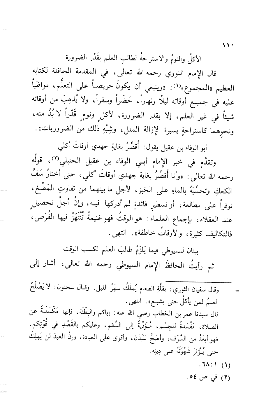 قال الإمام النووي رحمه الله تعالى، في المقدمة الحافلة لكتابه العظيم ((المجموع)) (¬1): ((وينبغي أن يكون حريصا على التعلم، مواظبا عليه في جميع أوقاته ليلا ونهارا، حضرا وسفرا، ولا يذهب من أوقاته شيئا في غير العلم، إلا بقدر الضرورة، لأكل ونوم قدرا لا بد منه، ونحوهما كاستراحة يسيرة لإزالة الملل، وشبه ذلك من الضروريات)).